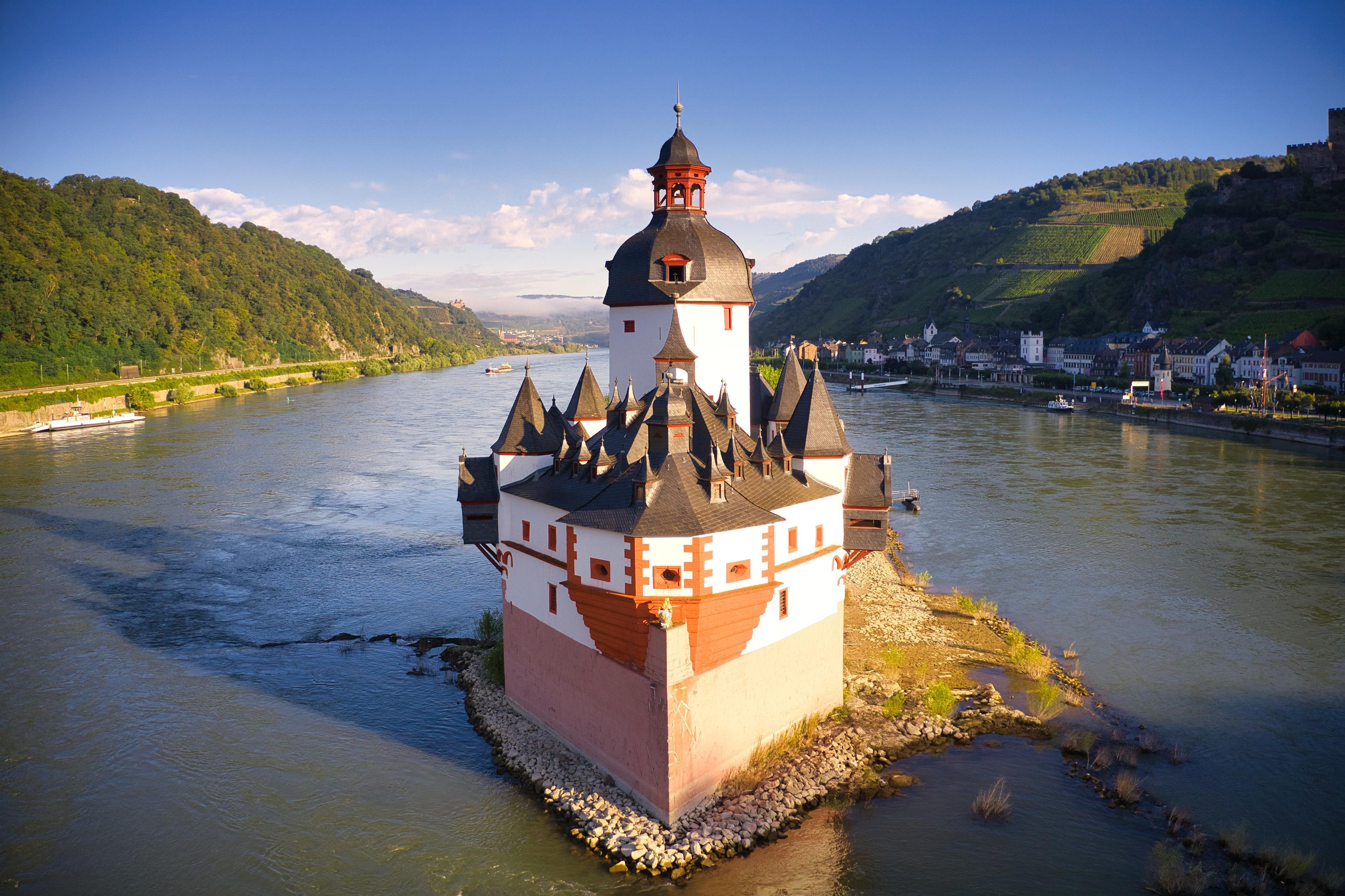 Die Pfalzgrafenstein thront in Form eines steinernen Schiffes im Rhein vor Kaub.
