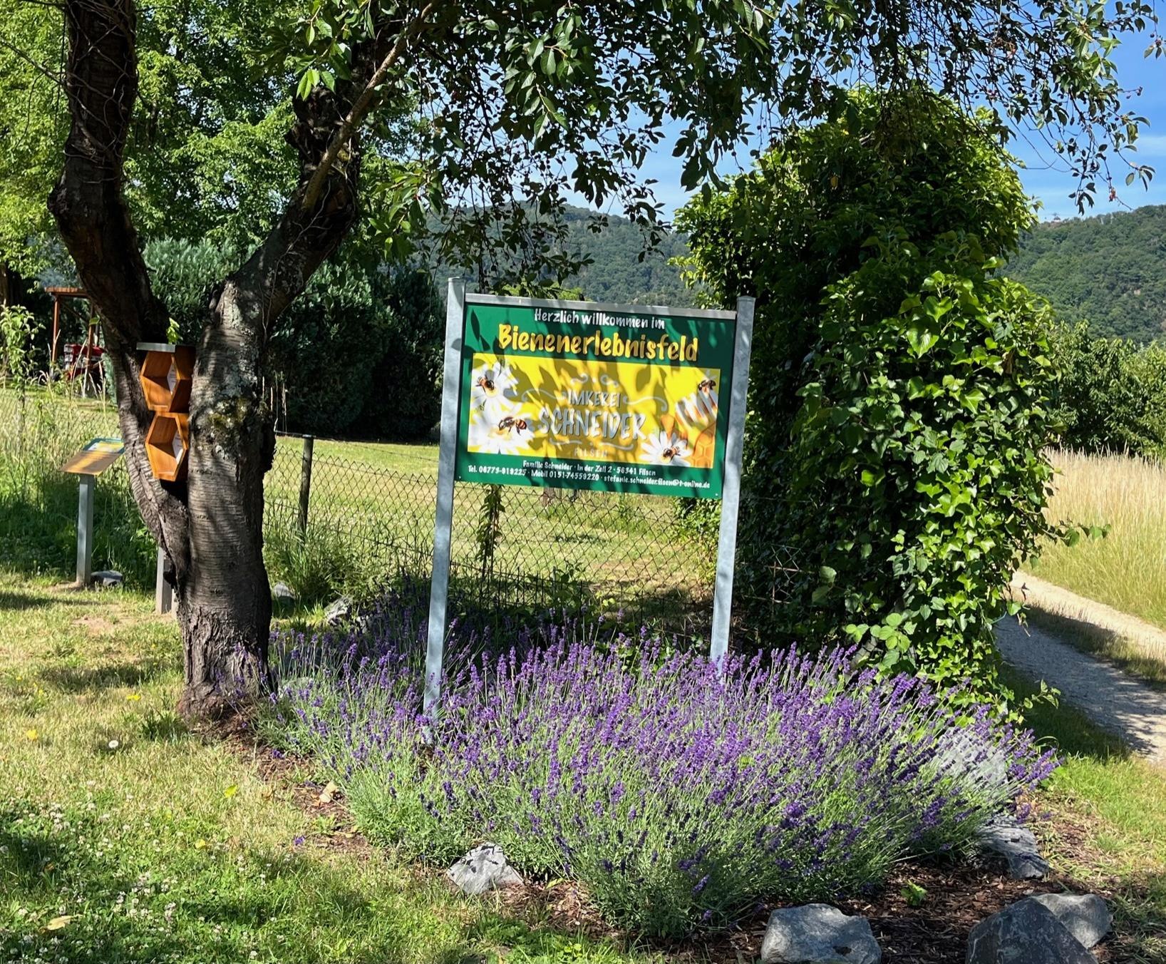 In the newly created flowering field of the Schneider beekeeping, located directly on the Rheinsteig and Kirschenpfad, children and adults can learn many things about the lifestyles of wild bees, honey bees, and beekeeping.